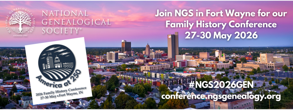 ALLEN COUNTY PUBLIC LIBRARY GENEALOGY CENTER PREVIEW — If you missed the April 8 Zoom program featuring Curt Witcher, MLS, FUGA, IGSF, and other ACPL staff, I’m fairly certain it will be able to watch on the NGS YouTube channel shortly. You can also check out the 2026 NGS Family History Conference Preview currently posted – https://youtu.be/uLHZL8iHPRg