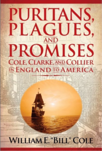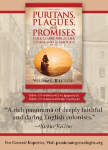 ![]() | Cole, William E. "Bill" | Puritans, Plagues, and Promises: Cole, Clarke, and Collier in England to America Puritan, Plagues, and Promises chronicles clashing forces in England during the sixteen and seventeenth centuries. Genealogical breakthroughs on the Cole, Clarke, & Collier families are included. “Religious persecution, deadly infections, and the lure of a new life drove the Pilgrims to Plymouth, according to this sprawling genealogical history. Cole investigates the lives of his English forebears … during the late 16th and early 17th centuries, and the forces that propelled them to Massachusetts.” “Cole effectively fleshes it out with lucid, colorful evocations of Elizabethan life, from period prayers to a scene at the famous Globe Theatre. The result is a captivating exploration of the fervent dreams and harsh realities of the colonial era.” A rich panorama of deeply faithful and daring English colonists. – Kirkus Reviews | Non-fiction | https://www.passionategenealogist.org/shop/puritans-plagues-and-promises-cole-clarke-and-collier-in-england-to-america/ |